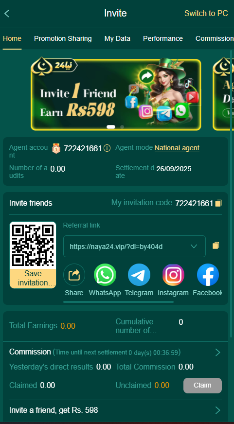 One of the best things about Naya24 Game is its Invite & Earn program, which allows you to make money without playing. All you need to do is share your referral link with friends and family.